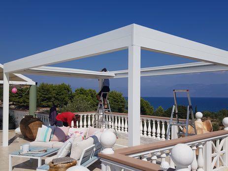 Innovative Pro-Line pergola with curved crossbars, zero-inclination installation, and a refined parapet for a clean, elegant look.